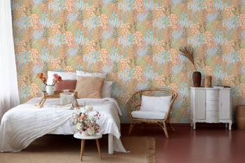 Wallpaper with a vinyl surface, brown-orange background, floral and leaf motifs with golden details, fine texture.