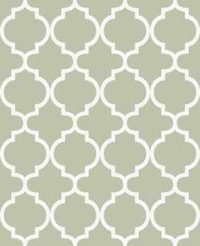 Wallpaper, sage-green background, cream trellis pattern.
