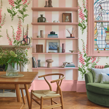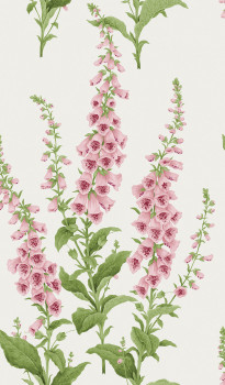 Wallpaper, cream background, foxglove pattern in shades of pink and green.