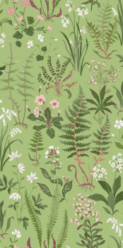 Wallpaper, green background, pattern of spring flowers and ferns.