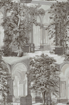 Wallpaper with motif of historical arcades and trees in semi-gloss shades of beige-grey.