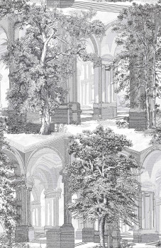 Wallpaper with motif of historical arcades and trees in semi-gloss shades of grey-black.