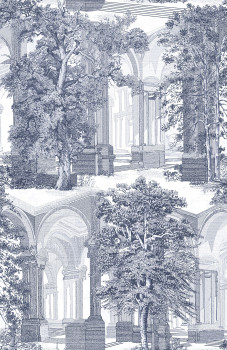 Wallpaper with motif of historical arcades and trees in shades of blue and grey-blue.