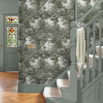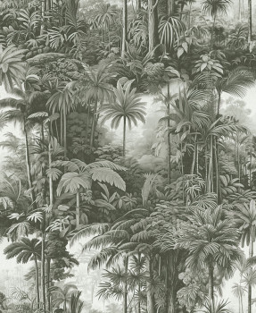 Wallpaper with jungle motif, palms, trees, leaves, in grey-black shades.