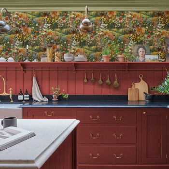 Wallpaper with blooming meadow motif, in shades of green, red, blue, pink, and yellow.