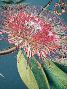 Wallpaper with green background, motif of blooming Passionflower branches.
