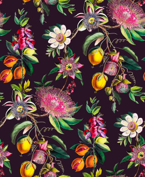 Wallpaper with black background, motif of blooming Passionflower branches.