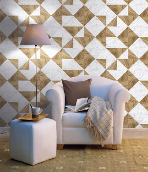 Mosaic tiling imitation in a combination of marble - wood on a non-woven wallcovering. We recommend the Beeline adhesive for instalation.