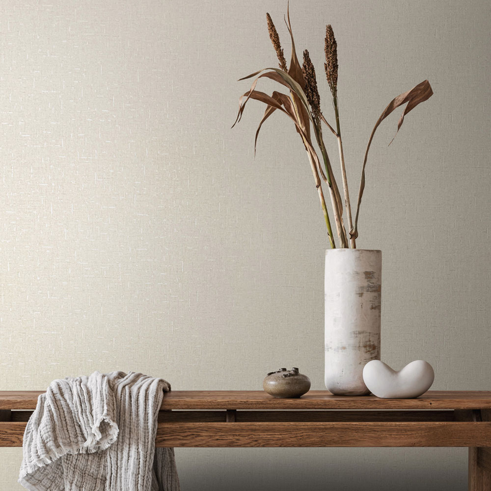 Wallpaper with a vinyl surface, fabric texture in beige tones, with metallic accents.