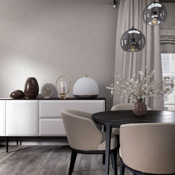 Wallpaper with a vinyl surface, fabric texture in beige tones, with silver details and metallic effects.