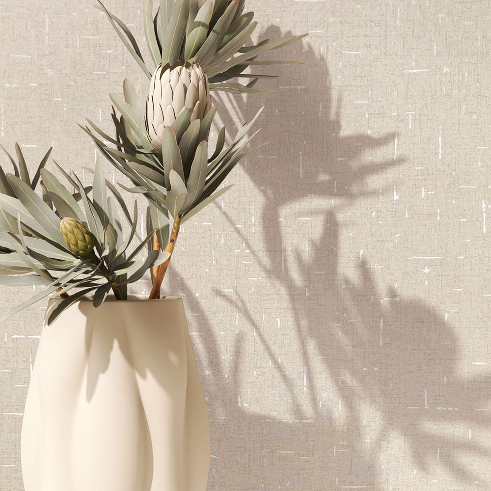 Non-woven wallpaper with a vinyl surface, fabric texture in cream tones, with glossy details and metallic accents.