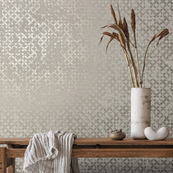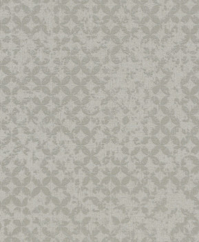 Non-woven wallpaper with a vinyl surface, fabric texture in grey tones, silver metallic vintage pattern.