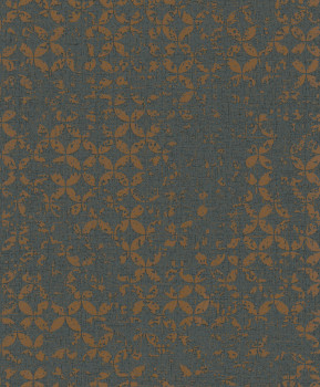 Non-woven wallpaper with a vinyl surface, fabric texture in grey-black tones, embossed bronze metallic vintage pattern.