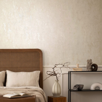 Non-woven wallpaper with a vinyl surface, light beige plaster finish design, fine texture.