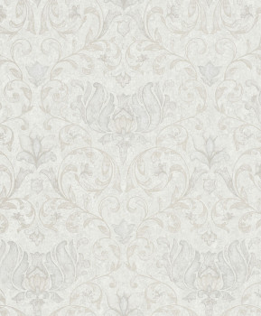 Non-woven wallpaper with a vinyl surface, regal ornamental pattern in a vintage style, in shades of grey-beige, fine texture.