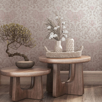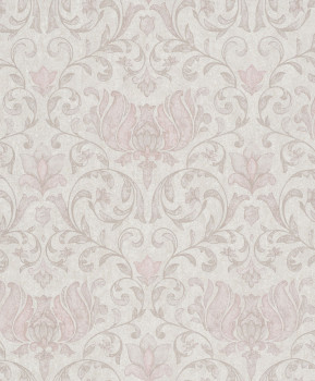 Non-woven wallpaper with a vinyl surface, regal ornamental pattern in a vintage style, in shades of grey-beige and pink, fine texture.