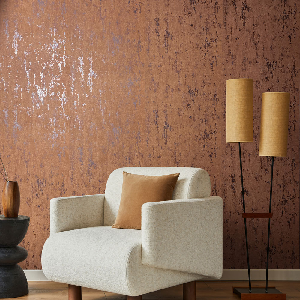 Non-woven wallpaper with a vinyl surface, brown plaster finish design with metallic embossing, fine texture.