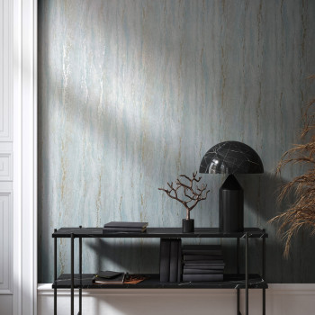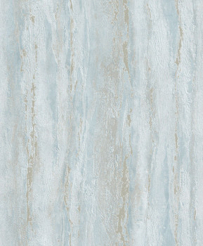 Non-woven wallpaper with a vinyl surface, turquoise plaster finish design with metallic golden embossing, fine texture.