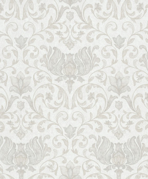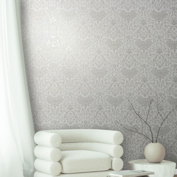 Non-woven wallpaper with a vinyl surface, regal ornamental pattern in a vintage style, in shades of cream and beige, fine texture.