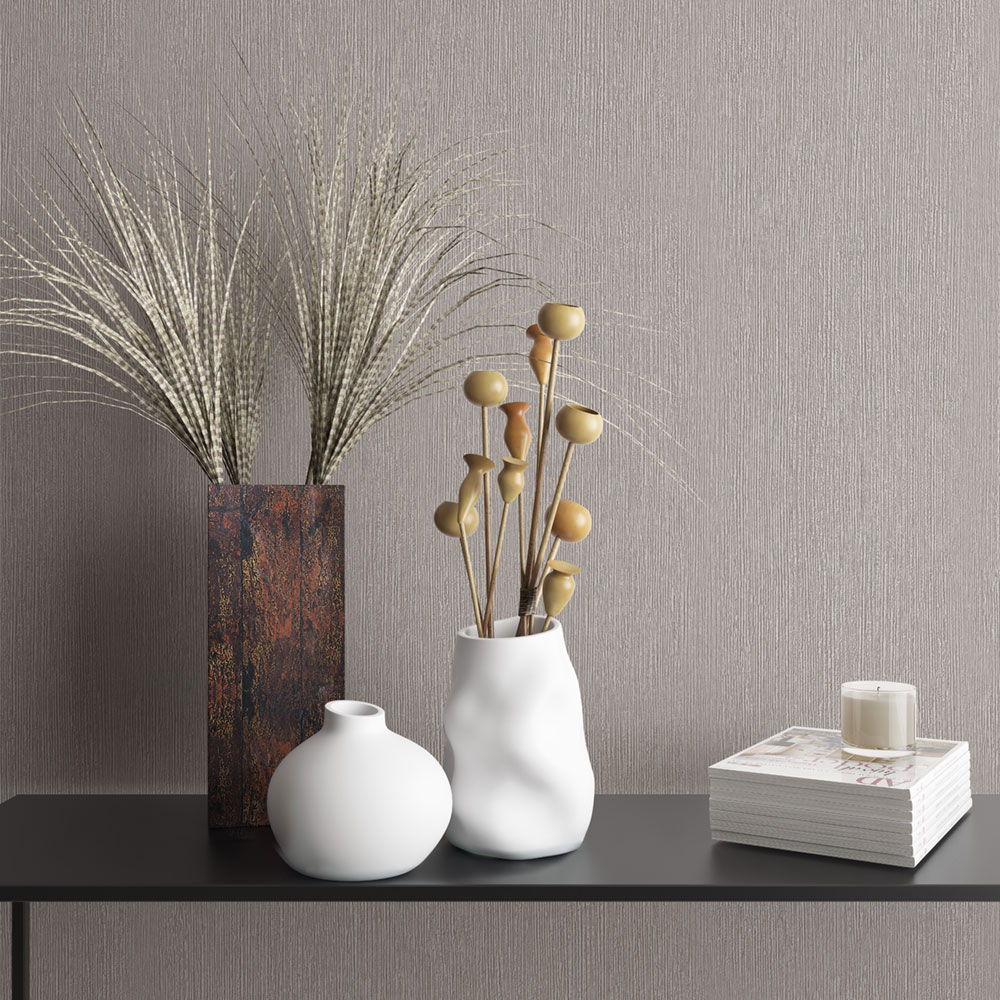 Wallpaper with a vinyl surface, vertical texture inspired by wood grain in shades of grey and brown.
