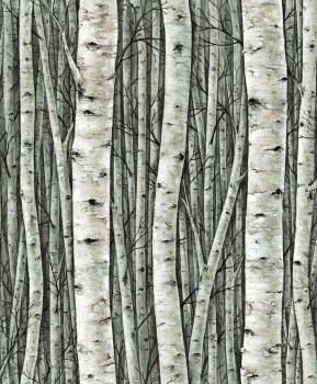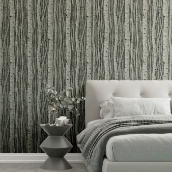 Wallpaper with a vinyl surface, striped texture with a birch grove tree motif in green tones.