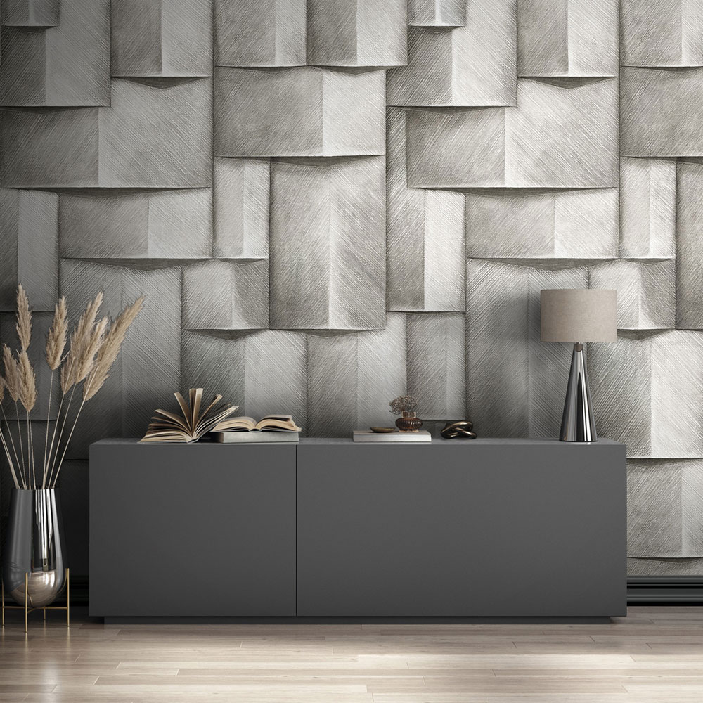Wallpaper with a vinyl surface, fine texture, graphic pattern with shading creating a 3D effect.