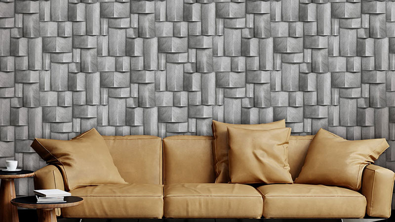 Wallpaper with a vinyl surface, fine texture, graphic pattern with shading creating a 3D effect in brown and grey-brown tones.