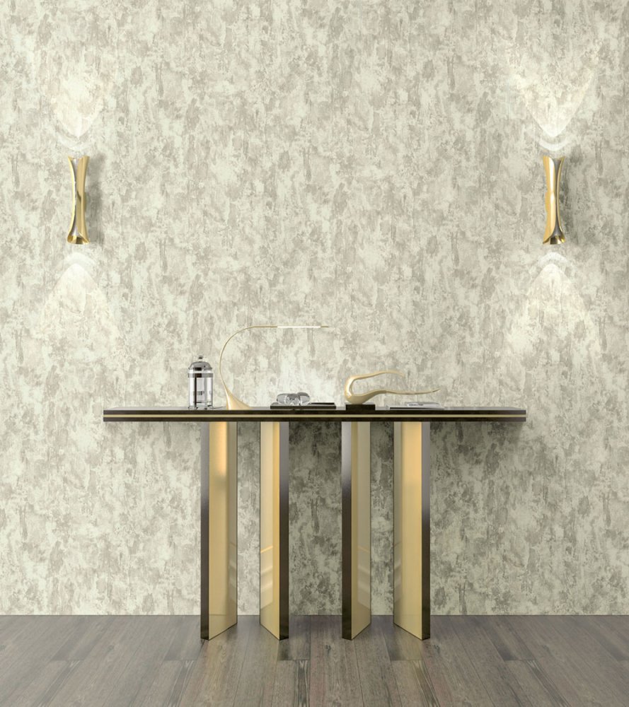 Non-woven, brown-beige wallpaper with a vinyl surface. Imitation of stucco plaster with golden metallic reflections.