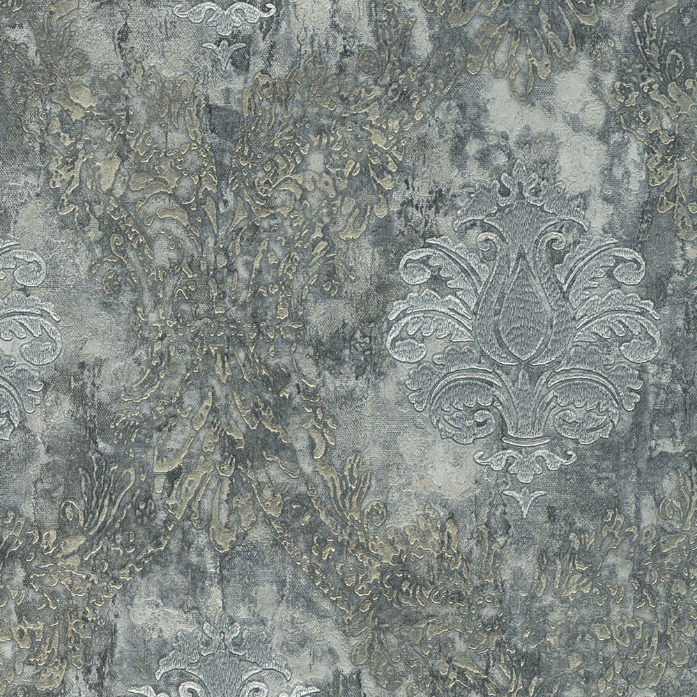 Non-woven wallpaper with a vinyl surface. Imitation of stucco plaster with finely embossed damask pattern with silver and gold reflections.