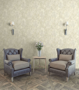 Non-woven wallpaper with a vinyl surface. Imitation of stucco plaster with finely embossed damask pattern with metallic reflections.