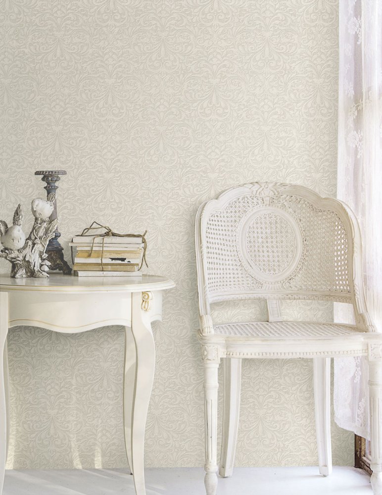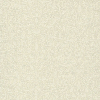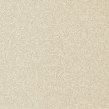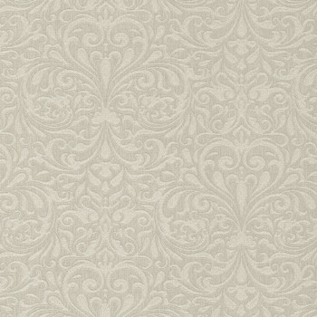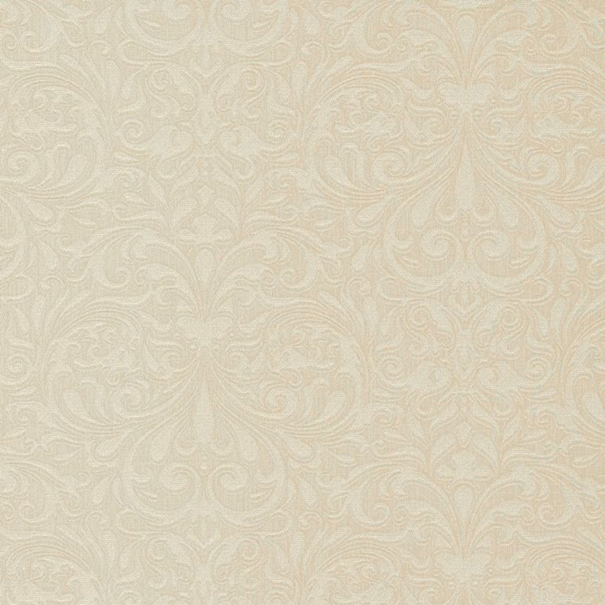 Non-woven wallpaper with a vinyl surface and fabric texture. Finely embossed baroque ornamental pattern with golden reflections.