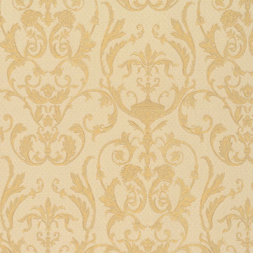 Vinyl, light beige wallpaper with gold ornamental pattern. Soft semi-gloss.