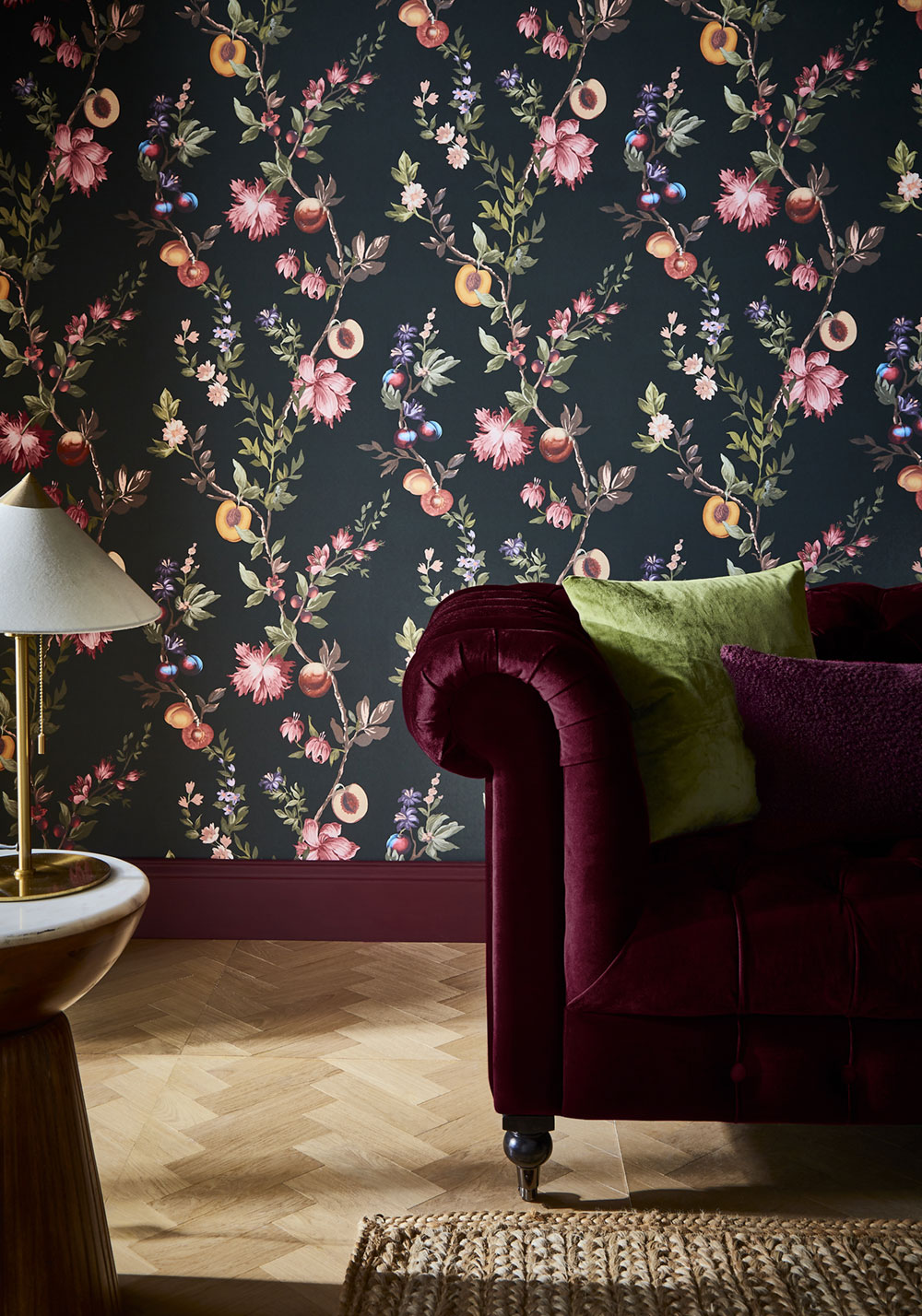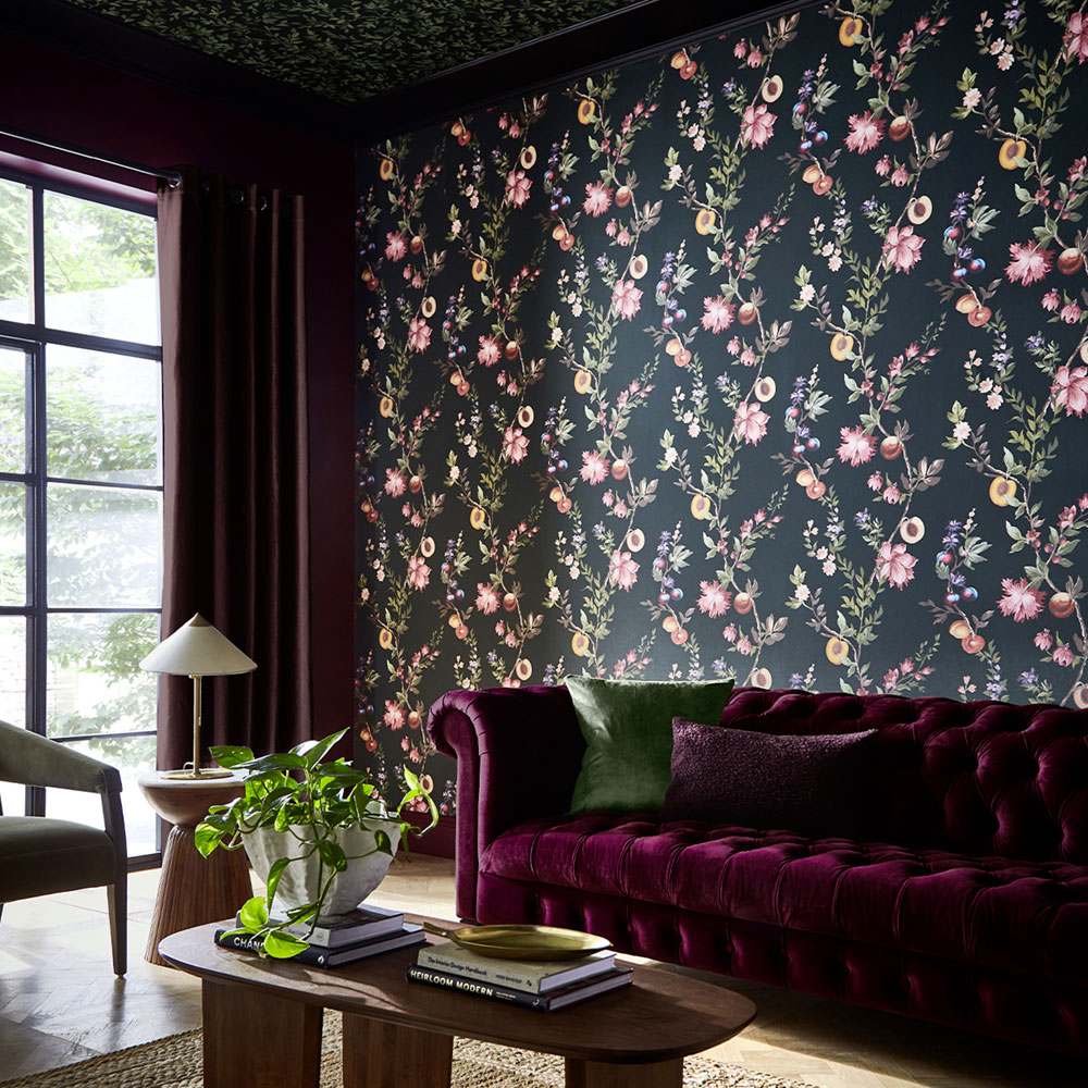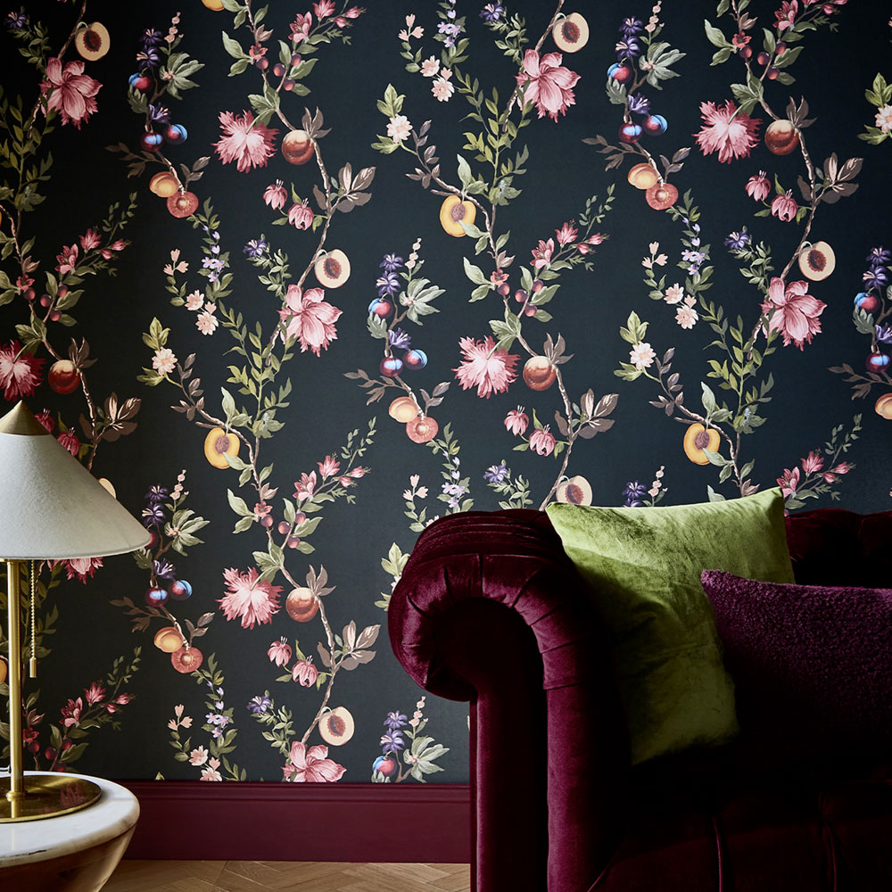 You will find striking floral patterns, ranging from tiny blossoms on dark backgrounds that feel bold, elegant, and slightly seductive, to softer variations on light backgrounds. A beautiful feature is the branches of peach trees and other fruit trees, full of blossoms and fruit, adding a sense of naturalness, freshness, and a romantic atmosphere to the wallpapers.