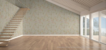 Luxury non-woven wallpaper with a vinyl finish, fabric texture, light beige background, plants in light shades of green, orange-pink flowers.