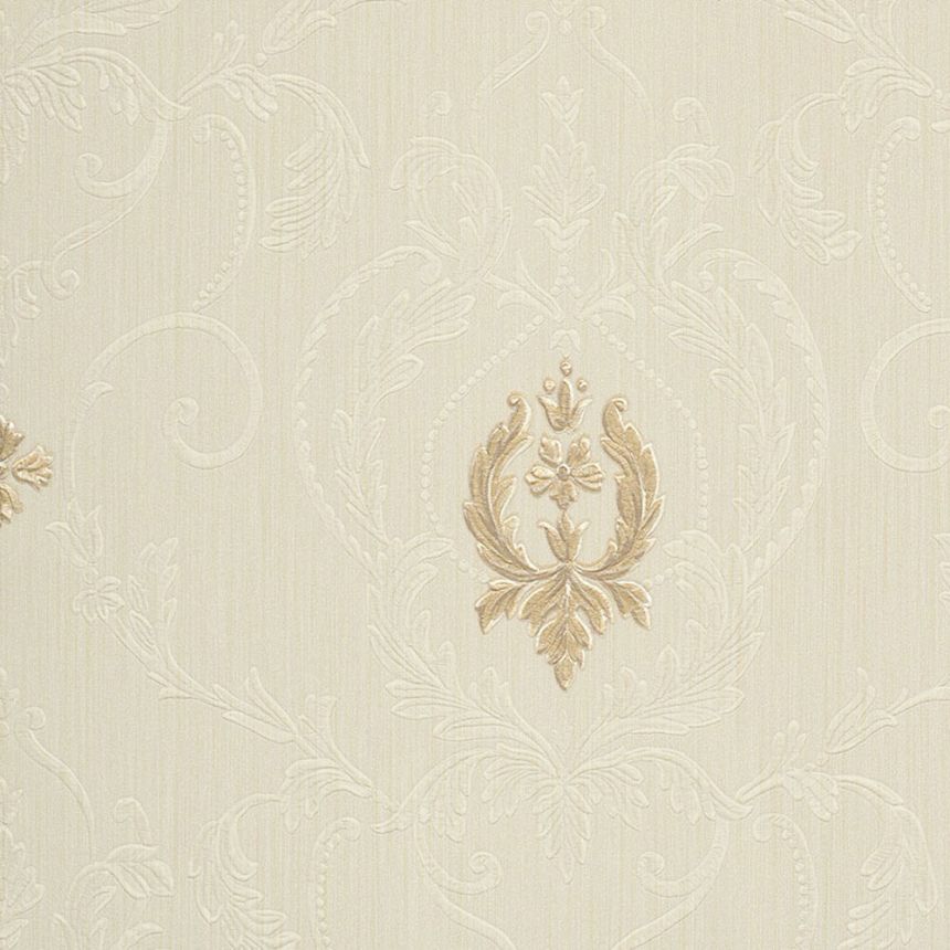 Vinyl, cream wallpaper with a metallic gray-beige baroque pattern.