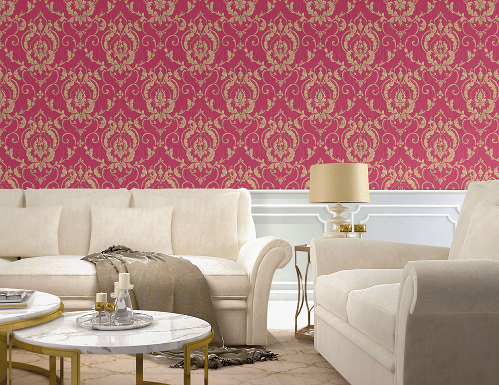 Vinyl, raspberry wallpaper with a metallic gold baroque pattern.