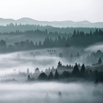 Non-woven wallpaper with a forest landscape motif in a fog. 6 panels