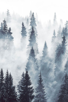 Non-woven wallpaper with a motif of trees in a fog. 4 panels
