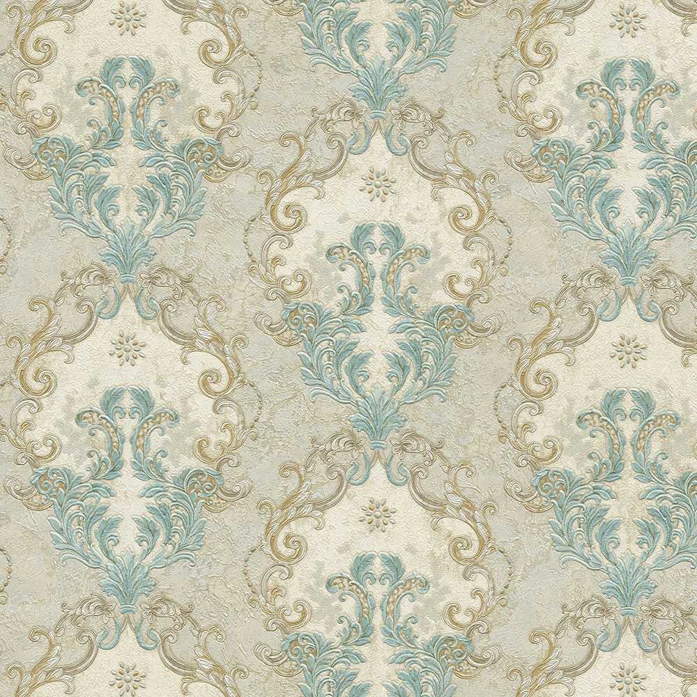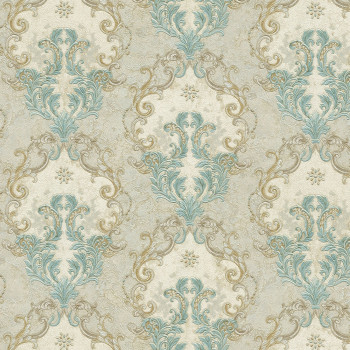 Luxury non-woven wallpaper with a vinyl surface. Rich baroque ornamental pattern, shades on wallpaper - gray background, patternin blue, gray-silver and gold.