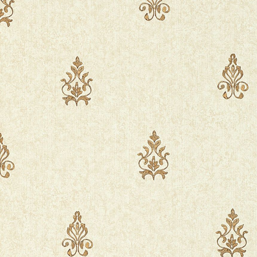 Luxury vinyl matte cream / gray-beige wallpaper with a gold baroque ornamental pattern - silver reflections every here and there, design and texture of a fine fabric.