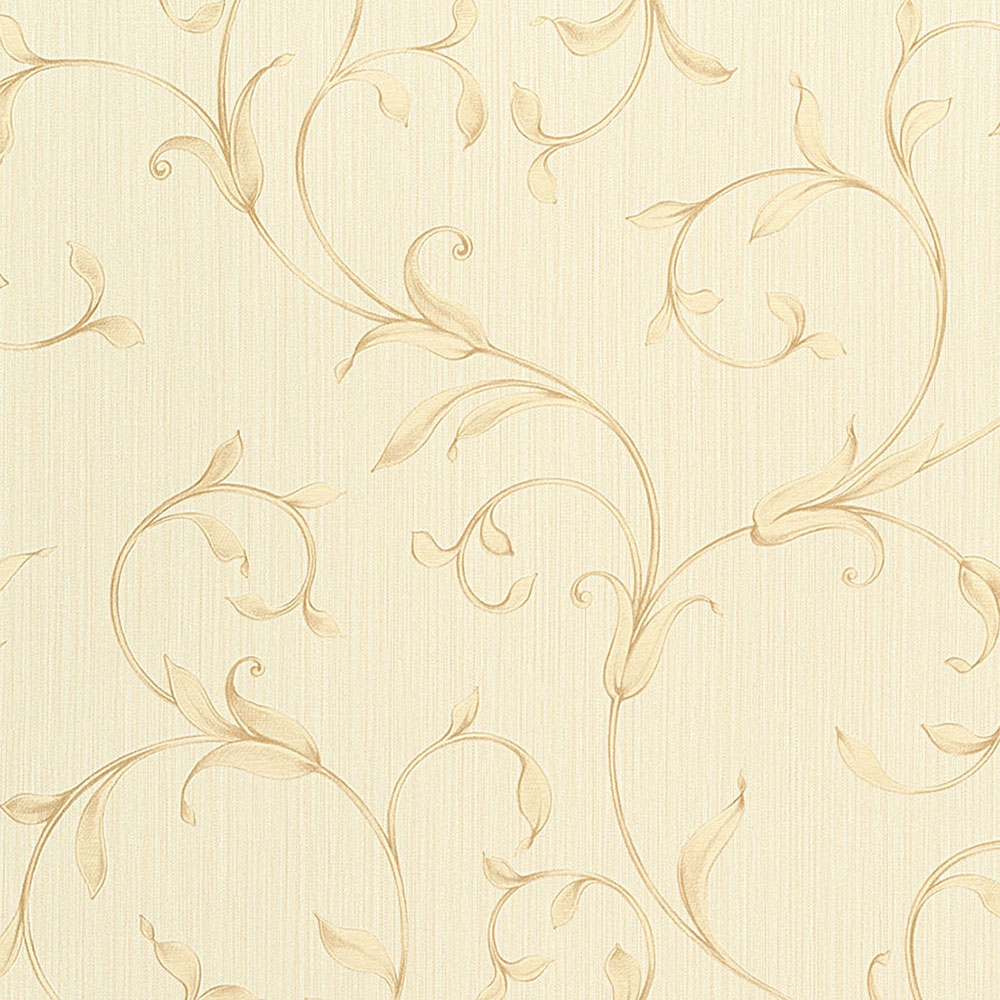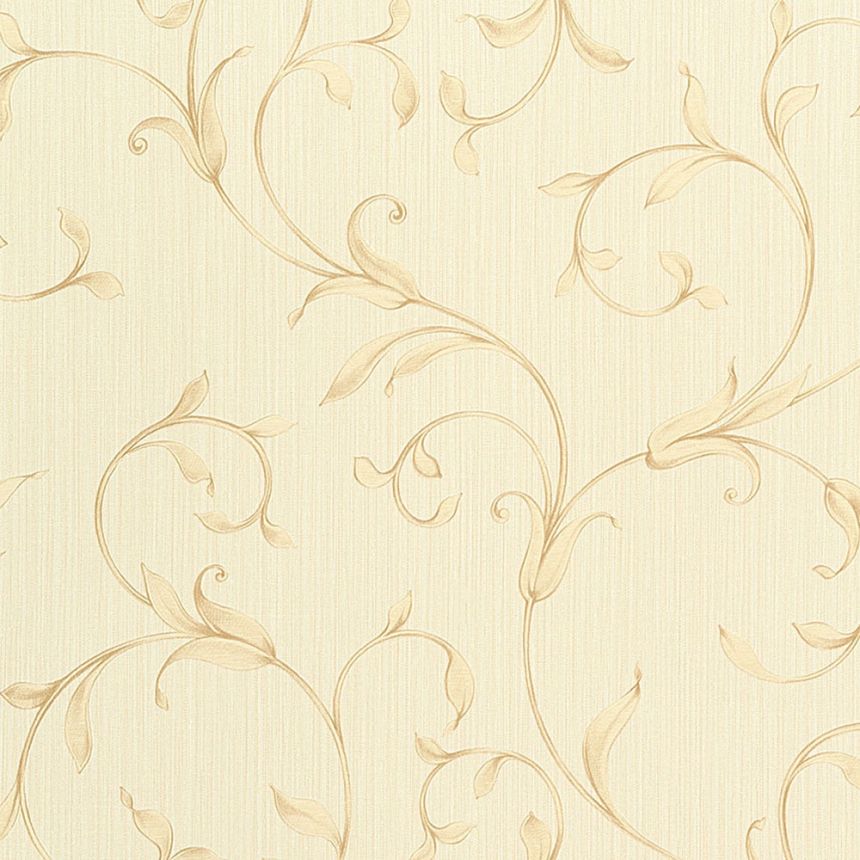 Luxury, semi-glossy beige vinyl wallpaper with golden-beige floral ornaments, design and texture of a fine fabric.