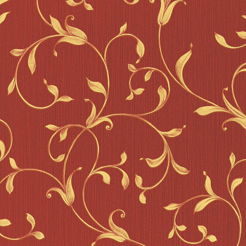 Luxury, red semi-glossy vinyl wallpaper with gold floral ornaments, design and texture of a fine fabric.