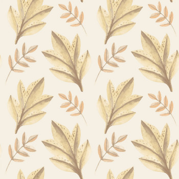 Smooth non-woven wallpaper, white background, larger brown-beige leaves 20 cm long, smaller orange-brown-gray leaves 15 cm long.