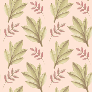 Smooth non-woven wallpaper, pink background, larger brown-green leaves 20 cm long, smaller pink-brown leaves 15 cm long.