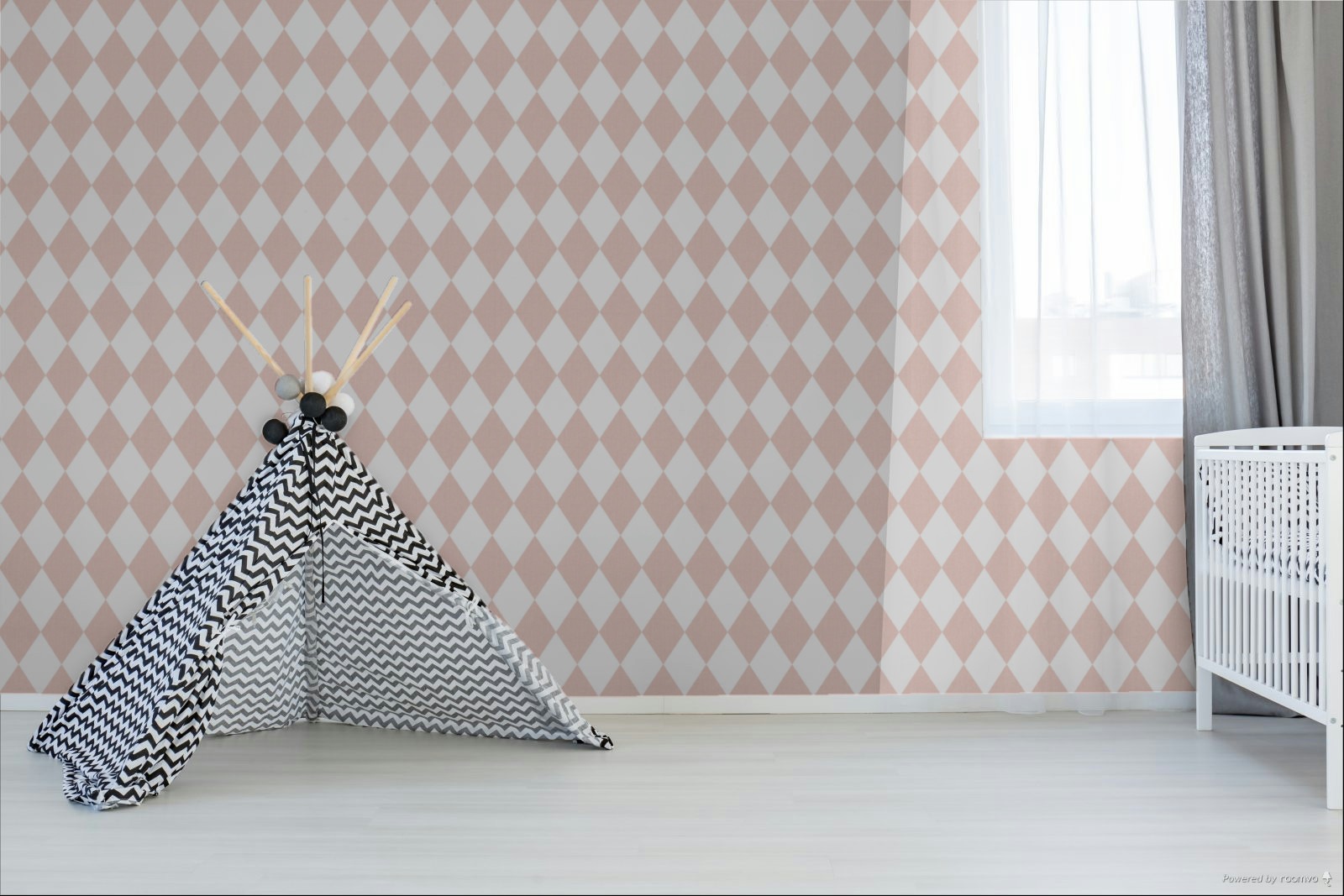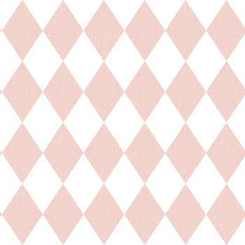Non-woven wallpaper with a delicate textile texture, featuring pink and white diamonds.