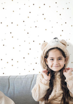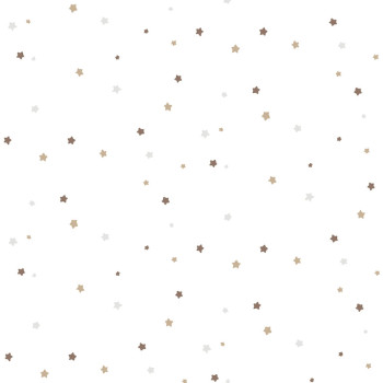 Smooth non-woven wallpaper, white background, with brown, gold, and gray stars measuring 0.5 and 1 cm.