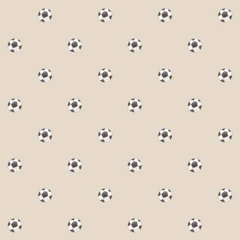Playful non-woven wallpaper for kids' rooms, featuring soccer balls on a beige background, with balls in a combination of black, white, and gray.