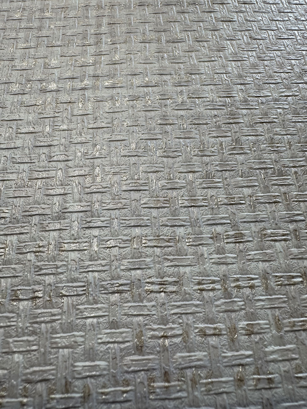 Luxury non-woven wallpaper in cream tones, interwoven texture with metallic details.