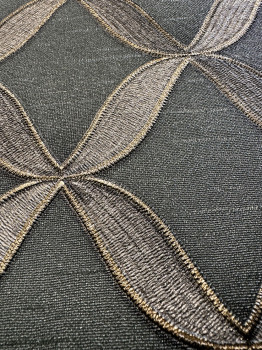 Luxury non-woven wallpaper, green with anthracite pattern, metallic gold outlines, fabric texture.