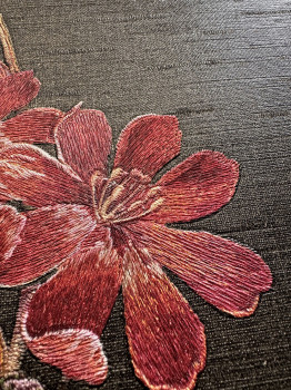 Luxurious non-woven wallpaper with a black background and metallic burgundy flowers.